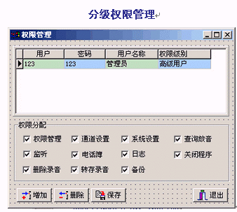 。。通話錄音或留言進(jìn)行查詢(xún)管理,可按日期、時(shí)間、電話號(hào)碼、線路、通話長(zhǎng)度、人員等條件對(duì)錄音進(jìn)行快速檢索、播放,也可將錄音文件進(jìn)行刪除、標(biāo)記、轉(zhuǎn)存、備份等操作。分級(jí)權(quán)限管理