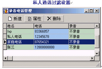。。通過(guò)對(duì)某些特殊電話號(hào)碼的禁止錄音設(shè)置,DVS將自動(dòng)過(guò)濾該號(hào)碼進(jìn)行不錄音處理,以滿(mǎn)足私人通話及特殊場(chǎng)合的需要。