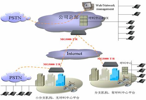 如圖,利用大唐高鴻的VoIP產(chǎn)品MG3000-T4或者MG3000-A/R系列,可以根據(jù)實際遠端用戶數(shù)量選擇相應產(chǎn)品,將多個呼叫中心通過IP網(wǎng)絡匯接,從而實現(xiàn)呼叫中心到各地客戶的低廉話費,節(jié)省呼叫中心整體運營、管理費用。