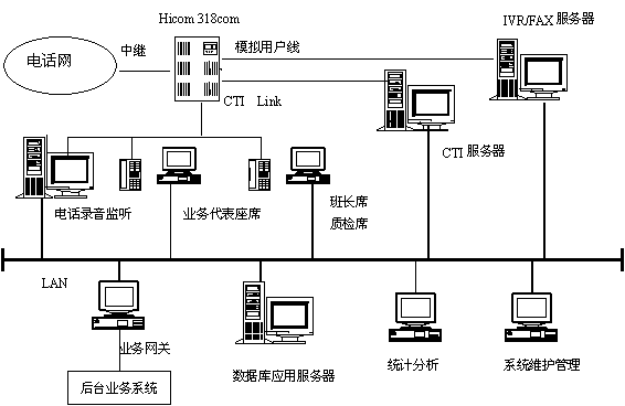 主要包括:Siemens Hicom 318com交換機(jī)、CTI服務(wù)器、IVR/FAX服務(wù)器、業(yè)務(wù)代表座席、班長和質(zhì)檢座席、電話錄音監(jiān)聽系統(tǒng)、數(shù)據(jù)庫應(yīng)用服務(wù)器、統(tǒng)計(jì)分析工作站、系統(tǒng)維護(hù)管理工作站、業(yè)務(wù)網(wǎng)關(guān)、網(wǎng)絡(luò)系統(tǒng),其邏輯結(jié)構(gòu)下圖所示。