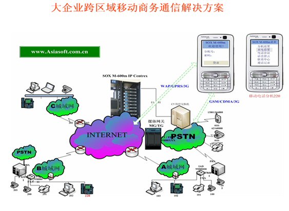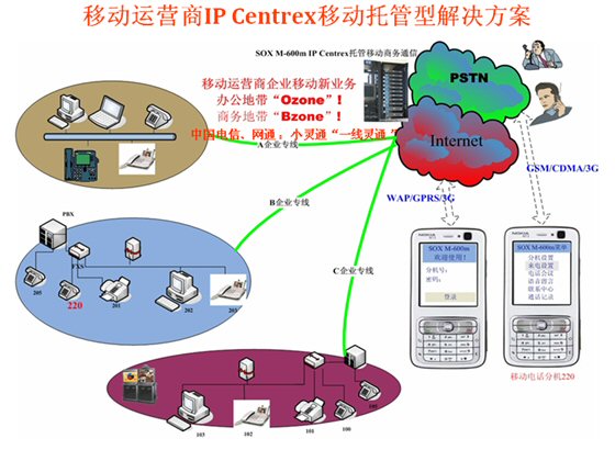 SOX-M融合通信移動總機系統(tǒng)通過與運營商NGN的互聯(lián)互通的接入實現(xiàn)企業(yè)總機號碼的規(guī)劃(如固網(wǎng)可以放固網(wǎng)PSTN號碼,移動可以放移動GSM或CDMA號碼),并通過一系列WEB管理界面實現(xiàn)各種業(yè)務(wù)功能的快速開通和企業(yè)的自服務(wù)WEB界面管理分機特性,由于SOX-M系統(tǒng)是移動軟交換SOFTSWITCH的設(shè)計理念和實現(xiàn)原理,采用支持SIP/H.323等協(xié)議,并設(shè)計出核心的移動分機交換模塊,實現(xiàn)移動電話(手機)綁定分機號碼完全實現(xiàn)了“移動隨身分機”(這樣的分機之間可任意轉(zhuǎn)接,可聽取留言Voice Mail,可發(fā)起WAP電話會議,可訪問企業(yè)的CRM、ERP等應(yīng)用軟件并集成點擊呼叫等等)。不僅移動運營商可以替代第一代的移動總機,固網(wǎng)運營商采用SOX-M移動軟交換也可以輕松的開展移動總機(小靈通或手機)的業(yè)務(wù)了,但SOX-M系統(tǒng)融合移動運營商的無線互聯(lián)網(wǎng)數(shù)據(jù)業(yè)務(wù)將產(chǎn)生更大的利于企業(yè)應(yīng)用的前景,移動總機(語音+WAP)的融合應(yīng)用成為第二代移動總機殺手級應(yīng)用,令移動總機如虎添翼。