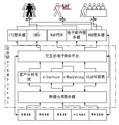 交互式電子商務(wù)平臺(tái):負(fù)責(zé)將企業(yè)內(nèi)部的系統(tǒng)和企業(yè)的電子渠道(如:WEB、電子郵件、WAP、手機(jī)短消息和呼叫中心(Call Center)等)與企業(yè)內(nèi)部的業(yè)務(wù)系統(tǒng)(如:銷(xiāo)售系統(tǒng)、ERP系統(tǒng))等連接起來(lái)共同為客戶提供更為有效的服務(wù)。