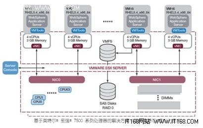 另外,由于電信行業(yè)的特殊性,許多舊的應(yīng)用無(wú)法快速有效的部署在新平臺(tái)下,造成服務(wù)器利用低,服務(wù)器的數(shù)量越來(lái)越多的問(wèn)題,為此,英特爾與東軟也從幾年前開(kāi)始進(jìn)行密切合作,在早期的英特爾至強(qiáng)7300、至強(qiáng)7400、至強(qiáng)7500等一系列四路高端服務(wù)器平臺(tái)上搭建了虛擬化解決方案,使過(guò)去電信舊的應(yīng)用能夠很快在新平臺(tái)上進(jìn)行部署。下圖顯示的是東軟以兩臺(tái)基于英特爾至強(qiáng) 7500 系列處理器的四路服務(wù)器為基礎(chǔ),構(gòu)建了整個(gè) BSS 架構(gòu):