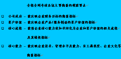 全程全網(wǎng)考核策略目標(biāo)因果關(guān)系圖是"平衡計(jì)分卡"應(yīng)用的重要環(huán)節(jié),在此要特別強(qiáng)調(diào)?因?yàn)樗菍⒏鶕?jù)公司遠(yuǎn)景規(guī)劃以及使命確定的四個(gè)考核維度轉(zhuǎn)化為全程全網(wǎng)考核系統(tǒng)進(jìn)入實(shí)際操作階段之關(guān)鍵步驟。在平衡記分卡的設(shè)計(jì)過(guò)程中,它起著承前啟后的作用,在構(gòu)建呼叫中心全程全網(wǎng)考核系統(tǒng)中全程全網(wǎng)考核策略目標(biāo)因果關(guān)系圖的突破性銜接功能-以其邏輯性的架構(gòu)來(lái)界定和描述實(shí)現(xiàn)全面績(jī)效考核的策略方案。將公司成功、客戶(hù)價(jià)值、核心流程和呼叫中心核心能力之間的關(guān)聯(lián)清晰地呈現(xiàn),并將企業(yè)的策略與其績(jī)效衡量系統(tǒng)相銜接。