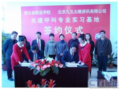 12月18日上午,密云縣職業(yè)學(xué)校與北京九五太維資訊有限公司校企合作共建呼叫專業(yè)實(shí)習(xí)基地簽約儀式在密云縣職業(yè)學(xué)校隆重舉行,市教委職成處處長(zhǎng)李敏,縣委常委副縣長(zhǎng)王春林、副縣長(zhǎng)錢福生、副縣長(zhǎng)徐芳出席簽約儀式并發(fā)表了講話。密云縣教委主任李鐘勤,北京九五太維資訊有限公司董事長(zhǎng)汪遠(yuǎn),首席執(zhí)行官李寶民及其培訓(xùn)師團(tuán)隊(duì),密云縣經(jīng)濟(jì)開發(fā)區(qū)總公司及部分入?yún)^(qū)呼叫企業(yè)出席了簽約儀式。此次活動(dòng)標(biāo)志著北京呼叫中心產(chǎn)業(yè)基地人才培養(yǎng)工作步入正軌,隨著以密云縣職業(yè)學(xué)校為主體的人才培養(yǎng)模式的確立,長(zhǎng)期困擾呼叫行業(yè)人才短缺的困難有望得到解決。
