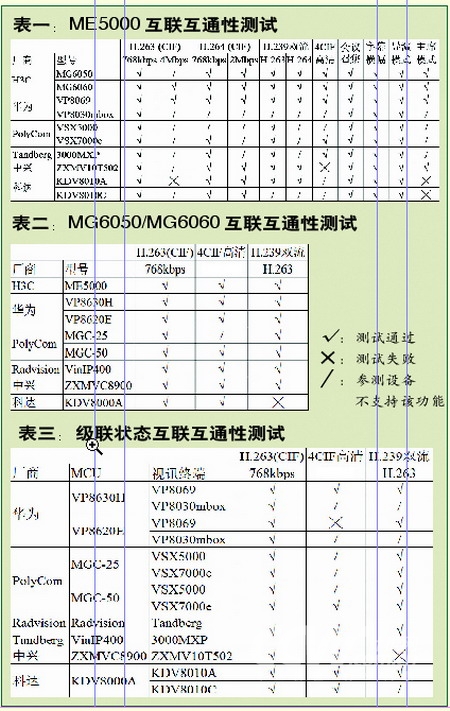 眼見為實(shí),為了驗(yàn)證H3C視訊產(chǎn)品的互聯(lián)互通性,我們對其進(jìn)行了實(shí)際測試。互聯(lián)互通性屬應(yīng)用級特性,測試起來并不困難,但有些煩瑣。由于視訊系統(tǒng)核心組件通常包括MCU和視訊終端兩類設(shè)備,兼容性互有交叉,因此我們將測試分成3組進(jìn)行。參與測試的設(shè)備除H3C的MCU(多點(diǎn)控制單元)ME5000和視訊終端MG6050/MG6060外,還包括其它5個(gè)廠商的7款MCU和8款視訊終端。