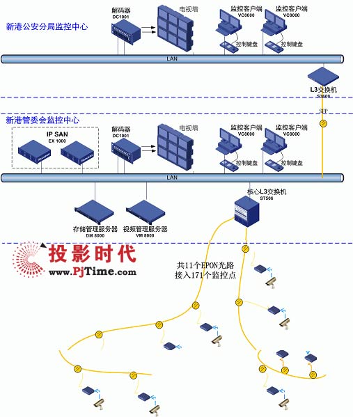 除了攝像頭與圖像顯示設備之外,整個監(jiān)控系統(tǒng)主要采用的都是H3C設備。系統(tǒng)用11(應改成10條,最終只用了10條)條EPON光路接入全部171個監(jiān)控攝像頭;并采用專業(yè)的EX1000存儲產品為120T關鍵歷史視頻數(shù)據(jù)的提供了高可靠性的存儲保護;而S7506、S3600交換機優(yōu)化的組播特性和特色的雙流技術則確保了所有監(jiān)控點的高清晰、高實時性、支持大量并發(fā)訪問。系統(tǒng)的集中管理、批量配置、全網(wǎng)網(wǎng)管也可以為新港開發(fā)區(qū)節(jié)省管理成本。