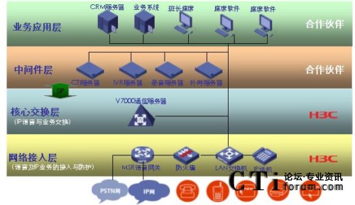H3C公司采用標(biāo)準(zhǔn)的IP語音SIP協(xié)議,基于VCX純IP語音通信平臺,與合作伙伴產(chǎn)品集成,為客戶提供新一代純IP呼叫中心解決方案。基于純IP的語音通信平臺,客戶可以快速實現(xiàn)呼叫中心系統(tǒng)的部署,并且方便實現(xiàn)遠(yuǎn)程坐席、虛擬坐席的實施方案;實現(xiàn)多種媒體通信方式,如采用郵件、傳真、即時通信、WEB等方式快速建立客戶和企業(yè)之間的溝通橋梁,提高呼叫中心坐席處理客戶業(yè)務(wù)的效率;更重要的是,基于SIP協(xié)議優(yōu)秀的開放特性,IP呼叫中心能夠快速實現(xiàn)同各種語音增值應(yīng)用的集成,更好的將IP語音通信技術(shù)應(yīng)用到呼叫中心的系統(tǒng)服務(wù)中來。