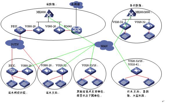 省水利設(shè)計(jì)院已經(jīng)部署了200門容量的PBX,采用語(yǔ)音網(wǎng)關(guān)將PBX及其下掛的模擬電話接入系統(tǒng)后,除了不需要連接水利部語(yǔ)音系統(tǒng)外,其組網(wǎng)與省防總完全一致,與省水利設(shè)計(jì)院連接的PBX可采用VG80-20,使用2個(gè)E1連接。