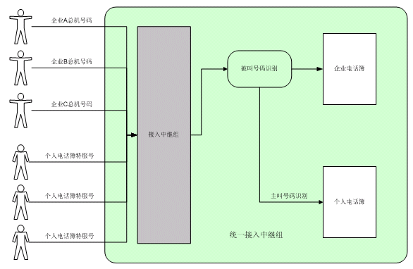 企業(yè)電話簿呼叫中,系統(tǒng)將根據(jù)被叫號(hào)碼判別進(jìn)入相應(yīng)的企業(yè)電話簿,提供相應(yīng)的集團(tuán)總機(jī)服務(wù)。如需在同一組接入中繼中同時(shí)提供企業(yè)電話簿業(yè)務(wù)和個(gè)人電話簿業(yè)務(wù),則系統(tǒng)將首先進(jìn)行被叫號(hào)碼鑒別。若存在與被叫號(hào)碼相對(duì)應(yīng)的企業(yè)電話簿,則提供企業(yè)電話簿服務(wù);否則,進(jìn)行主叫號(hào)碼鑒別,判斷是否提供個(gè)人電話簿服務(wù)。