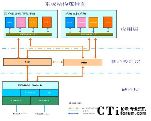 MC是整個的系統(tǒng)控制核心,其完成對iSX4000 交換機(jī)的所有控制功能,包括系統(tǒng)配置管理、呼叫控制、媒體網(wǎng)關(guān)控制和媒體資源管理等。應(yīng)用層的業(yè)務(wù)應(yīng)用程序發(fā)起的所有控制命令,通過MC路由到指定的iSX4000交換機(jī)上,并由iSX4000交換機(jī)最終完成指定的操作,而操作的結(jié)果最終通過MC,返回給業(yè)務(wù)應(yīng)用程序。同理,由iSX4000交換機(jī)發(fā)起的控制信號,亦是通過MC來派發(fā)給特定的業(yè)務(wù)應(yīng)用程序,業(yè)務(wù)應(yīng)用程序處理后,通過MC反饋給iSX4000交換機(jī)。