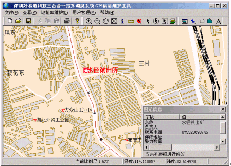 好易通三臺合一指揮調(diào)度警用地理信息子系統(tǒng)是好易通三臺合一指揮調(diào)度系統(tǒng)的一個重要組成部分,主要參考《警用地理信息系統(tǒng)建設(shè)規(guī)范》以及公安部《縣、市級公安機關(guān)"三臺合一"接處警系統(tǒng)技術(shù)規(guī)范》設(shè)計,基于MapInfo平臺開發(fā),接處警人員可運用該子系統(tǒng)對案發(fā)地點進行多中定位(模糊定位、輔助定位),多種查詢及多種調(diào)度。