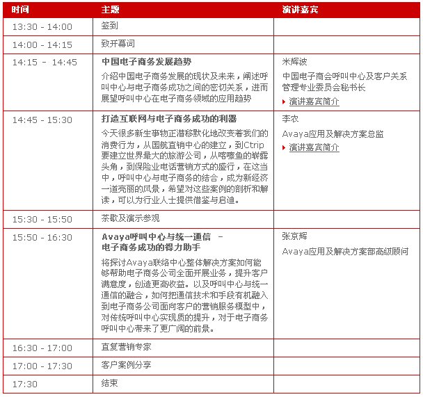 全球企業(yè)通信的領導者Avaya特別針對電子商務公司舉辦呼叫中心及統(tǒng)一通信研討會。通過本次研討會,您不但能夠深入了解呼叫中心和統(tǒng)一通信的優(yōu)勢,讓其在您自己的電子商務平臺上大展身手,還能與來自國內(nèi)各大網(wǎng)站、電視購物公司、網(wǎng)上商城等企業(yè)的IT技術(shù)專家和業(yè)務部門管理者共聚一堂,圍繞呼叫中心及統(tǒng)一通信在電子商務領域的實踐應用召開廣泛交流探討。