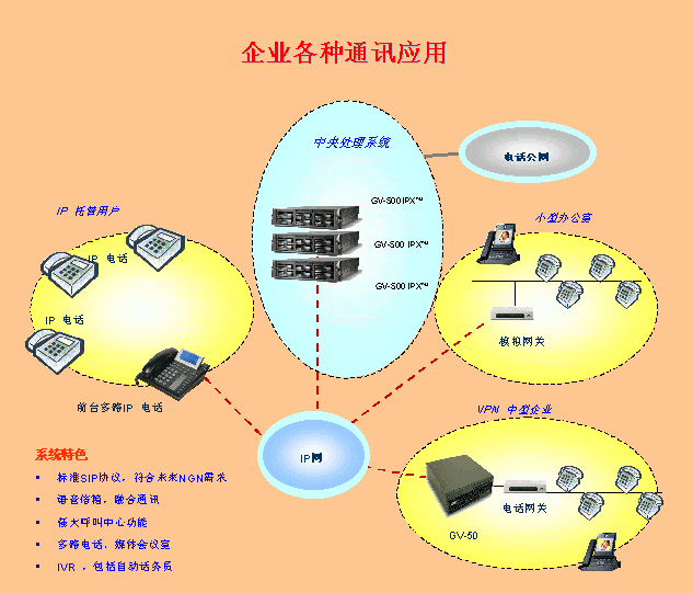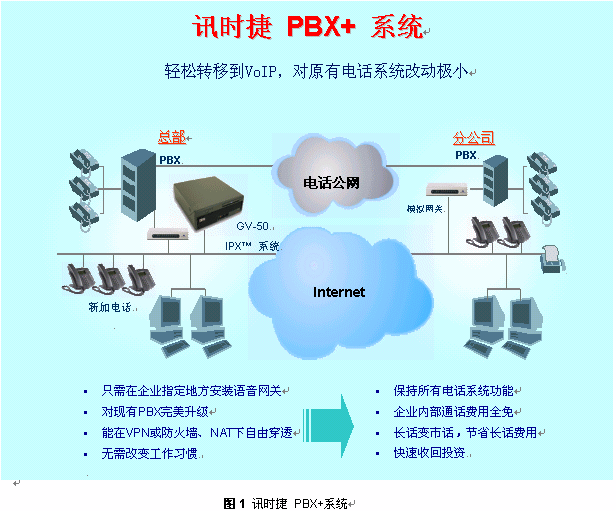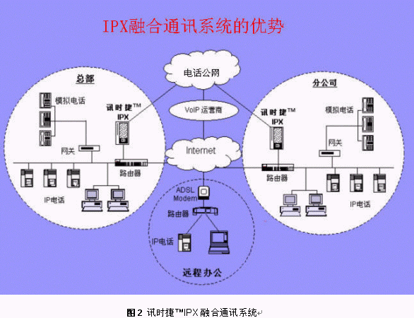 將訊時(shí)捷?IPX放在公司總部,其它分支機(jī)構(gòu)可以通過(guò)IP話(huà)機(jī),軟電話(huà)或者網(wǎng)關(guān)設(shè)備登錄到總部的IPX上,這樣就形成了整個(gè)公司的VOIP網(wǎng),建立了企業(yè)自己的通訊平臺(tái)。