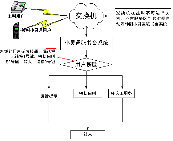 當主叫用戶撥打被叫小靈通用戶,而被叫小靈通用戶處于不可達(關機、忙、不在服務區(qū))狀態(tài)時,該呼叫自動轉入轉到小靈通秘書臺系統(tǒng)后,用戶選擇短信回叫,系統(tǒng)在被叫小靈通用戶空閑后,會發(fā)送短信通知主叫用戶,被叫已經恢復狀態(tài),可以呼叫。