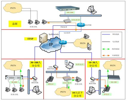 3.10至30人的分公司:通過增加桌面型IP-PBX(SE-30)及IP話機終端的方式改造。SE-30提供2路Bypass口,當網(wǎng)絡(luò)中斷時,可以作為連接PSTN的中繼端口;用戶終端采用IP話機或語音網(wǎng)關(guān),實現(xiàn)小規(guī)模的網(wǎng)絡(luò)電話應(yīng)用。