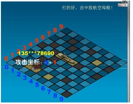 這里是游戲的主戰(zhàn)場,觀眾每發(fā)送一個轟炸坐標過來,都會在這里有體現(xiàn)。如轟炸者的手機號、攻擊坐標、是否擊中(擊中是一團火光,未擊中則是水花)、及語音及文字提示。