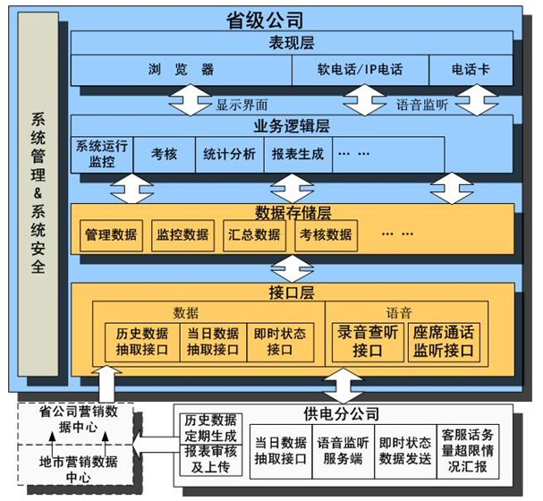 客服監(jiān)管系統(tǒng)中省級公司部分通過接口層與供電公司的客戶服務(wù)系統(tǒng)交換數(shù)據(jù)。通過業(yè)務(wù)邏輯層對接收到的數(shù)據(jù)進行處理、展現(xiàn),并且處理要發(fā)送的數(shù)據(jù),在此實現(xiàn)所有的業(yè)務(wù)邏輯。供電公司部分負責(zé)提供歷史的和當天的各種業(yè)務(wù)數(shù)據(jù)。整個結(jié)構(gòu)中也考慮到了數(shù)據(jù)中心,數(shù)據(jù)中心建立后將定期導(dǎo)入各供電公司客戶服務(wù)系統(tǒng)的歷史數(shù)據(jù),并提供給省級公司包括監(jiān)管系統(tǒng)在內(nèi)的各種應(yīng)用系統(tǒng)使用。