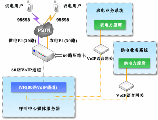 由于要保證供、農(nóng)電統(tǒng)一95598號碼的接入,呼叫中心系統(tǒng)采用供、農(nóng)電合一的方式,建立統(tǒng)一的呼叫中心系統(tǒng),并保證系統(tǒng)接入容量及其他資源能夠滿足統(tǒng)一的要求;在自動語音菜單中,分別設(shè)立供、農(nóng)電用戶層,用戶可以自行區(qū)分、選擇進(jìn)入相應(yīng)的導(dǎo)航菜單中,確認(rèn)之后,系統(tǒng)默認(rèn)記錄該用戶的類型,再次呼叫時(shí),系統(tǒng)自動識別該用戶供、農(nóng)電類型;在確認(rèn)了用戶類型之后,用戶選擇轉(zhuǎn)接人工座席時(shí),自動進(jìn)入相應(yīng)的供電座席組或者農(nóng)電座席組,并且,在確定轉(zhuǎn)接錯(cuò)誤分組之后,可以由座席進(jìn)行再次轉(zhuǎn)接。