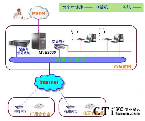 在技術(shù)上,旅游網(wǎng)IP呼叫中心解決方案的語音業(yè)務(wù)通過電信運(yùn)營商的模擬電話線路(或者模擬中繼線路)接入,數(shù)據(jù)業(yè)務(wù)都通過互聯(lián)網(wǎng)使用TCP/IP協(xié)議傳送,解決了呼叫中心中大量數(shù)據(jù)傳送的需求,請看下面的網(wǎng)絡(luò)組織結(jié)構(gòu)圖: