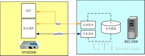 REC2000 是通過(guò)網(wǎng)絡(luò)共享方式,接收來(lái)自MVB2000通信平臺(tái)的錄音數(shù)據(jù)。將大量的磁盤(pán)讀寫(xiě)動(dòng)作分離,然后接收來(lái)自通信平臺(tái)的指令進(jìn)行錄音處理,從而有效降低MVB2000通信平臺(tái)CPU和磁盤(pán)負(fù)載。提供運(yùn)行監(jiān)控接口,通過(guò)通信平臺(tái)可實(shí)時(shí)監(jiān)控錄音服務(wù)器運(yùn)行狀態(tài)。