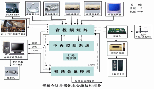 以上設(shè)備分別通過綜合信息網(wǎng)提供的100M快速交換以太網(wǎng)接入會(huì)議網(wǎng)系統(tǒng)。在控制室,我們配置一臺(tái)筆記本電腦,分別用來運(yùn)行會(huì)議管理系統(tǒng)、會(huì)議控制軟件,配置視頻會(huì)議系統(tǒng)會(huì)議存儲(chǔ)管理服務(wù)器對視頻會(huì)議網(wǎng)絡(luò)進(jìn)行統(tǒng)一監(jiān)控管理,會(huì)議存儲(chǔ)管理服務(wù)器用來存儲(chǔ)會(huì)議內(nèi)容供以后二次利用點(diǎn)播/廣播服務(wù)。他們均以100M快速交換以太網(wǎng)接入綜合網(wǎng)。在會(huì)議控制人員進(jìn)行管理時(shí),他們只需進(jìn)入控制軟件界面,輸入正確的口令后即可進(jìn)行會(huì)議管理和控制及會(huì)議設(shè)置和維護(hù),也可以通過配置的便攜式維護(hù)終端1套(筆記本電腦)進(jìn)行。見下圖: