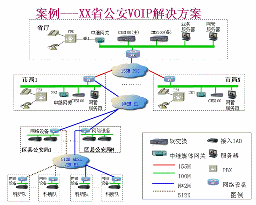 2. 在全省公安IP語音專網(wǎng)系統(tǒng)覆蓋范圍以內(nèi)的用戶通過專用廣域網(wǎng)接續(xù)。省廳和各市節(jié)點(diǎn)的軟交換均通過中繼媒體網(wǎng)關(guān)與本節(jié)點(diǎn)PBX互連,全省各區(qū)縣公安局和下轄科所隊(duì)均根據(jù)接入需要配置相應(yīng)端口數(shù)的語音接入設(shè)備IAD,各節(jié)點(diǎn)之間專網(wǎng)電話匯接、路由通過IP網(wǎng)絡(luò)來完成。