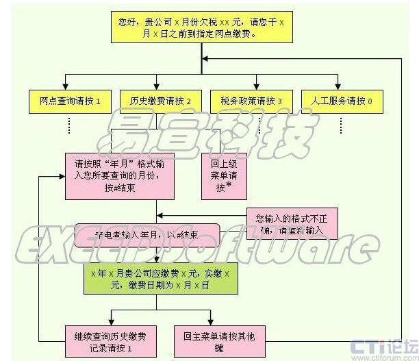 - 播放內(nèi)容為IVR交互式語(yǔ)音流程(也叫語(yǔ)音架構(gòu)),用戶和稅務(wù)部門能夠通過(guò)用戶的選擇產(chǎn)生互動(dòng)交流;