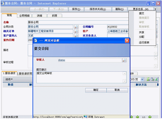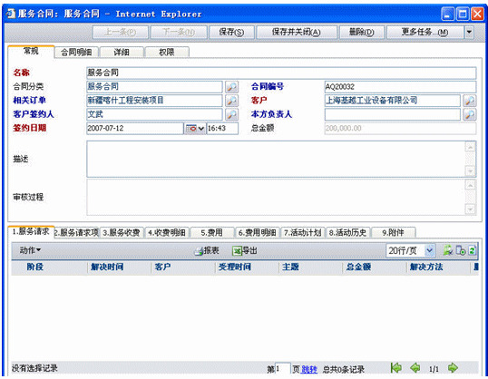 服務(wù)合同是也分為兩種,一種是非公司項(xiàng)目的服務(wù)請(qǐng)求此時(shí)沒有與訂單關(guān)聯(lián);二種是公司項(xiàng)目后服務(wù)請(qǐng)求,此時(shí)可以關(guān)聯(lián)訂單也可以不關(guān)聯(lián)訂單,如果關(guān)聯(lián)訂單就可以將訂單產(chǎn)品明細(xì)導(dǎo)入合同明細(xì)中(導(dǎo)入明細(xì)是可以調(diào)整數(shù)量和價(jià)格的).