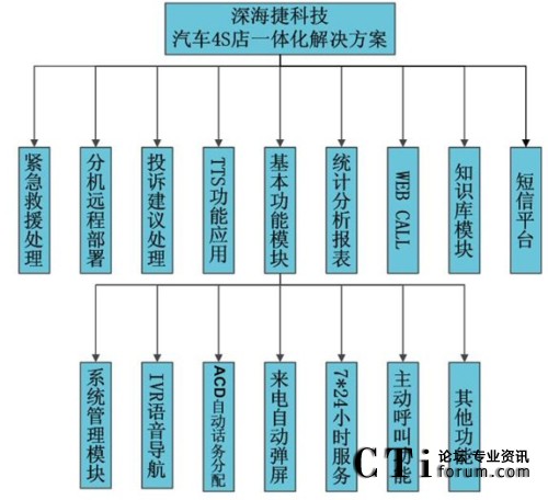 針對目前國內(nèi)汽車4S店的服務(wù)現(xiàn)狀,并結(jié)合4S店需求的獨特特點,專為國內(nèi)汽車4S店量身打造的深海捷汽車4S店聯(lián)絡(luò)中心系統(tǒng),除具備呼叫中心基本功能外,還集成了分機遠程部署、TTS功能、緊急救援處理模塊、投訴/建議受理模塊、WEB CALL模塊和短信平臺模塊等特色功能。總體功能結(jié)構(gòu)圖如下: