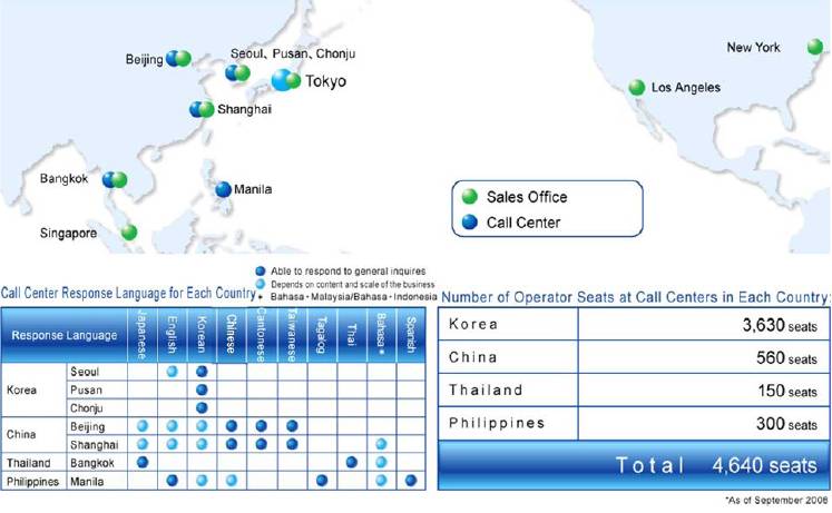 transcosmos運(yùn)用亞洲各呼叫中心營運(yùn)點(diǎn)提供客戶所需的業(yè)務(wù)種類和語言服務(wù)。每個(gè)運(yùn)營分部支持包括本地語言的多語種, 較少的運(yùn)營點(diǎn)覆蓋低業(yè)務(wù)量地區(qū)從而實(shí)現(xiàn)客戶要求的較低的運(yùn)營成本。這對(duì)滿足那些多語種要求的客戶來說尤其重要。