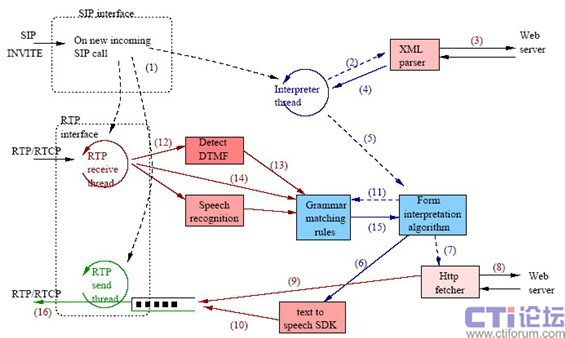 1. 當瀏覽器接收到一個新進來的SIP呼叫后,它創(chuàng)建三個不同線程:RTP接收線程、RTP發(fā)送線程和VoiceXML解釋器線程。RTP接收線程從主叫方接收媒體數(shù)據包并調用DTMF檢測模塊;RTP發(fā)送線程將媒體數(shù)據包以流的方式發(fā)送給主叫方。一個單獨的發(fā)送線程幫助維護外出數(shù)據報的固定帶寬(比如針對G.711音頻的64