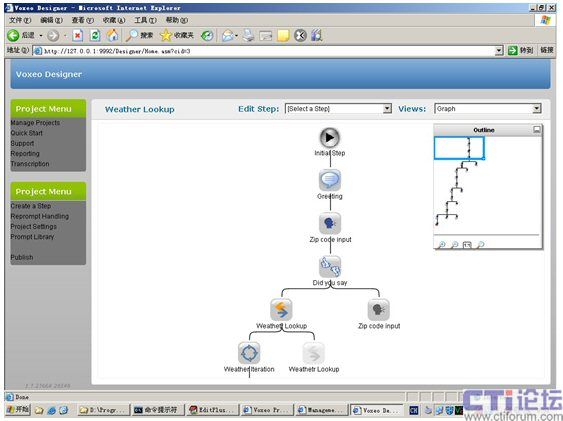 Home,在打開的Voxeo Prophecy網頁中點擊Prophecy Designer即開始了我們創(chuàng)建VoiceXML項目的輕松之旅。該設計工具將整個VoiceXML應用以圖表或樹狀結構直觀地呈現(xiàn)給開發(fā)者,可以方便地控制和修改其交互流程,如圖3所示。