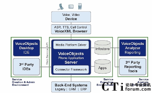 VoiceObjects體系結(jié)構(gòu)支持輕松地開發(fā)、部署和維護(hù)帶有語音、視頻、文本和移動互聯(lián)網(wǎng)接口的電話應(yīng)用。通過緊密集成提供實時分析的VoiceObjects分析器和提供應(yīng)用創(chuàng)建與維護(hù)的VoiceObjects桌面,VoiceObjects服務(wù)器成為提供動態(tài)對話和接口生成的執(zhí)行引擎。