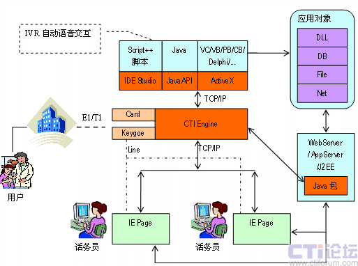 IVR部分,編寫(xiě)Script++腳本程序或VC/VB/Delphi/PB/Java應(yīng)用程序控制電路的接續(xù)以及放音、錄音收碼、轉(zhuǎn)移等。
