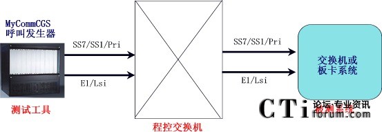 交換方案將MyCommCGS呼叫發(fā)生器和被測(cè)系統(tǒng)都通過(guò)同樣的電纜和信令方式連接到公網(wǎng)的程控交換機(jī)上,由呼叫發(fā)生器模擬公網(wǎng)用戶通過(guò)程控交換機(jī)向被測(cè)系統(tǒng)發(fā)起呼叫。
