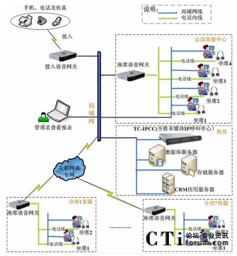 全勝通訊TC-IPCC實(shí)現(xiàn)電話營銷外呼和服務(wù)一體化呼叫中心的組網(wǎng)圖: