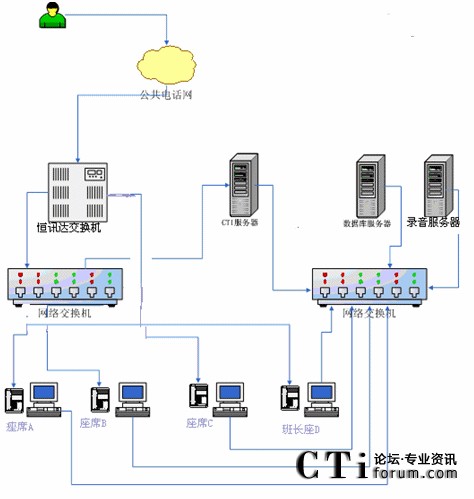 根據(jù)以上業(yè)務(wù)設(shè)計框架,我們確定了客服中心搭建時所需要的設(shè)備,系統(tǒng)的拓?fù)浣Y(jié)構(gòu)示意如下: