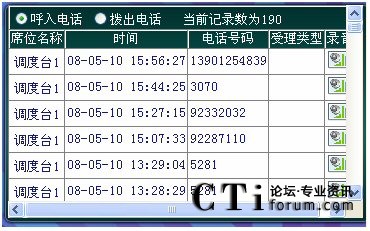 當(dāng)電話打進(jìn)來(lái),話務(wù)員提話機(jī)時(shí)系統(tǒng)便自動(dòng)進(jìn)行錄音,系統(tǒng)把語(yǔ)音信號(hào)以數(shù)字化語(yǔ)音格式寫(xiě)入硬盤(pán)。同時(shí)系統(tǒng)記錄其通話日期、摘機(jī)時(shí)間、掛機(jī)時(shí)間和當(dāng)前通話時(shí)間等信息,如果該次電話為打出電話,還可記錄其打出的電話號(hào)碼。當(dāng)值班人員掛機(jī)時(shí)系統(tǒng)便會(huì)自動(dòng)停止錄音。