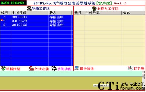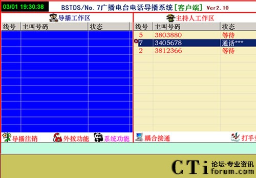 1、直播節(jié)目開播時(shí),參與者打進(jìn)電話,由導(dǎo)播把參與電話導(dǎo)入直播區(qū),這時(shí)直播區(qū)顯示參與者的電話號碼,主持人可以任意的選擇參與者進(jìn)行通話或掛機(jī)。