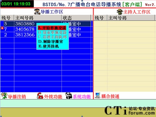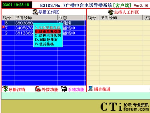 在上圖中,其中信號表示第5路、第7路、第2路分別來了3個(gè)電話,其電話號碼顯示在上面。其狀態(tài)都是在導(dǎo)播室中。這時(shí)導(dǎo)播想接通某路電話就在某路電話的上面點(diǎn)擊鼠標(biāo)右鍵會出現(xiàn)如下彈出示菜單: