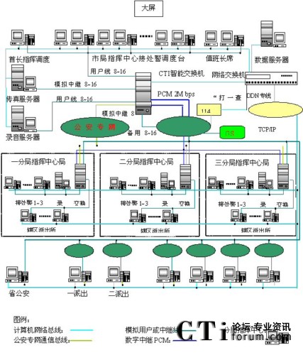 110、119、122報(bào)警電話的傳送與集中接聽(tīng)模式:所有轄區(qū)以內(nèi)的110、119、122報(bào)警電話都經(jīng)市電信局統(tǒng)一匯接,通過(guò)一條PCM2MBPS數(shù)字中繼送往市局指揮中心hxd09可編程智能語(yǔ)音交換機(jī)(簡(jiǎn)稱交換機(jī),下同)。再由交換機(jī)經(jīng)過(guò)數(shù)模轉(zhuǎn)換、排隊(duì)分配等處理后送往指揮中心各受理臺(tái)。此外,系統(tǒng)還備用了4條專用的模擬中繼線,用于當(dāng)PCM數(shù)字鏈路發(fā)生意外時(shí),作為傳送110、119、122報(bào)警電話的應(yīng)急備用專線。