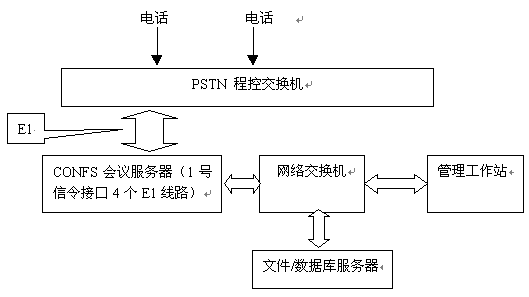 系統(tǒng)主要由網絡、數據庫服務器(DBS)、會議服務器(CONFS)、管理工作站幾個部分組成。數據庫服務器主要負責數據的存儲,而CONFS完成電話話路的接入與會議控制,彼此之間相輔相承。如圖所示: