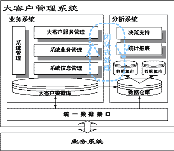 HollyAnalyzer是建立在大客戶信息平臺(tái)基礎(chǔ)上的針對(duì)業(yè)務(wù)主題、面向決策支持的系統(tǒng)。將數(shù)據(jù)倉(cāng)庫(kù)的相關(guān)技術(shù)引入,利用數(shù)據(jù)分析系統(tǒng),從基于客戶數(shù)據(jù)及企業(yè)業(yè)務(wù)活動(dòng)的歷史記錄中提煉出有用的信息產(chǎn)生標(biāo)準(zhǔn)的查詢報(bào)告,進(jìn)行大客戶分析和市場(chǎng)營(yíng)銷(xiāo)的輔助決策支持。分析主題主要針對(duì)客戶、競(jìng)爭(zhēng)對(duì)手和營(yíng)業(yè)及收入進(jìn)行分析,這些數(shù)據(jù)是企業(yè)非常關(guān)心的信息,有助于企業(yè)借助積累的歷史數(shù)據(jù),對(duì)其業(yè)務(wù)運(yùn)營(yíng)狀況及營(yíng)銷(xiāo)活動(dòng)成效做出正確的評(píng)價(jià),了解客戶行為及其趨向。