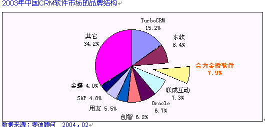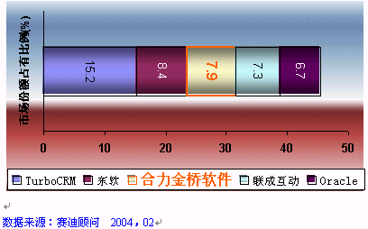 2004年2月10日,北京。賽迪顧問(wèn)(CCID Consulting )在中國(guó)大飯店隆重舉辦了"2004IT市場(chǎng)年會(huì)", 會(huì)上發(fā)布了《2003-2004年中國(guó)管理軟件產(chǎn)業(yè)投資機(jī)會(huì)研究年度報(bào)告》。HOLLYCRM(合力金橋軟件)公司在強(qiáng)手如林的評(píng)選中憑借其強(qiáng)勁的市場(chǎng)占有份額、深厚的品牌實(shí)力及出眾的用戶美譽(yù)度無(wú)可爭(zhēng)議地穩(wěn)居2003年度中國(guó)CRM軟件整體市場(chǎng)份額前三甲, 同時(shí)更奪得了2003年度中國(guó)電信行業(yè)CRM市場(chǎng)份額龍頭位置。