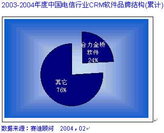 HOLLYCRM(合力金橋軟件)公司作為實(shí)力卓越的CRM主流廠商, 致力于提供最專業(yè)化的應(yīng)用軟件和服務(wù),提供以客戶為核心的信息化解決方案,服務(wù)領(lǐng)域跨越電信運(yùn)營(yíng)商、金融業(yè)、制造業(yè)等行業(yè)。在電信行業(yè)的CRM市場(chǎng)中,合力金橋軟件處于穩(wěn)固領(lǐng)先位置, 其推出的客戶關(guān)系管理解決方案,覆蓋協(xié)作型、運(yùn)營(yíng)型和分析型的全部范疇。在CRM產(chǎn)業(yè)在2003年的中國(guó)發(fā)展態(tài)勢(shì)整體放緩的大環(huán)境下, HOLLYCRM卻一枝獨(dú)秀, 在不到一年的時(shí)間里簽下中國(guó)網(wǎng)通總部、天津網(wǎng)通、山西網(wǎng)通、內(nèi)蒙聯(lián)通等大型CRM項(xiàng)目,積累了豐富的CRM項(xiàng)目實(shí)施經(jīng)驗(yàn)。在累計(jì)的電信行業(yè)CRM軟件市場(chǎng)中,合力金橋軟件一家占有份額就達(dá)到24%, 合力金橋軟件此次在CCID年度研究報(bào)告中倍受矚目可謂眾望所歸, 充分說(shuō)明了其CRM產(chǎn)品在高端行業(yè)的領(lǐng)軍地位, 如圖: