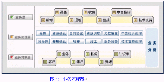 網(wǎng)通一站服務(wù)業(yè)務(wù)系統(tǒng):實(shí)現(xiàn)業(yè)務(wù)受理、資源確認(rèn)、費(fèi)用確認(rèn)、合同/協(xié)議、收費(fèi)、資源調(diào)度、竣工、業(yè)務(wù)預(yù)警、申告投訴處理、技術(shù)支持處理功能。其業(yè)務(wù)流程如下圖: