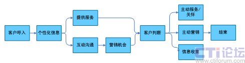 在上面的流程中,將一次客戶接觸,轉(zhuǎn)變?yōu)橐淮稳娴目蛻艋?dòng)機(jī)會(huì),通過對(duì)客戶信息360度的洞察和客戶的互動(dòng)溝通,在為客戶提供基本服務(wù)的同時(shí),根據(jù)客戶的基本資料、歷史消費(fèi)數(shù)據(jù)等,挖掘客戶的隱性需求,從而有選擇的開展客戶關(guān)懷、客戶信息收集、客戶維系、主動(dòng)營銷活動(dòng)。下面以一個(gè)電信運(yùn)營商的客戶呼入流程為例,說明在一個(gè)以客戶為中心的客戶接觸流程中,坐席代表可以開展的客戶接觸活動(dòng)(圖4)。