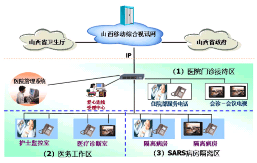 。。山西移動通信公司在獲悉遠程視訊業(yè)務可以有效預防SARS的情況下,隨即與山西省政府、省衛(wèi)生廳通電話,表達了山西移動愿意為山西防治SARS工作提供更先進的通信技術支持。山西移動與華為技術有限公司旋即制定了“愛心連線”遠程醫(yī)療、遠程探視實施方案,省衛(wèi)生廳及下屬太原市7家醫(yī)院要求盡快實施。目前該系統(tǒng)已經在山西省山大第一醫(yī)院開通,正值國家衛(wèi)生部SARS督察小組在山西各大醫(yī)院視察“防非”工作,整個系統(tǒng)運行穩(wěn)定,在SARS的防治工作中發(fā)揮了重要作用。