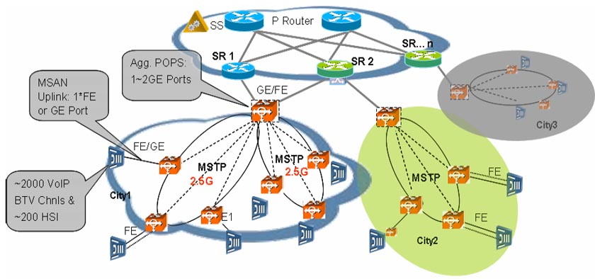 MSAN已經(jīng)逐漸成為基于IP架構(gòu)的下一代電信網(wǎng)建網(wǎng)的主要接入方式,近幾年越來越多的固網(wǎng)運營商普遍采用綜合接入(MSAN)建網(wǎng)模式,如英國的最大固網(wǎng)運營商英國電信的21CN網(wǎng)絡(luò),中國的最大固網(wǎng)運營商中國電信、中國網(wǎng)通,巴西的最大固網(wǎng)運營商Telemar等。而MSTP單一平臺具備支持MSAN接入的所有業(yè)務的承載要求,且成本最低。華為公司MSTP設(shè)備具有強大的數(shù)據(jù)接入?yún)R聚及傳送特性,并通過Metro